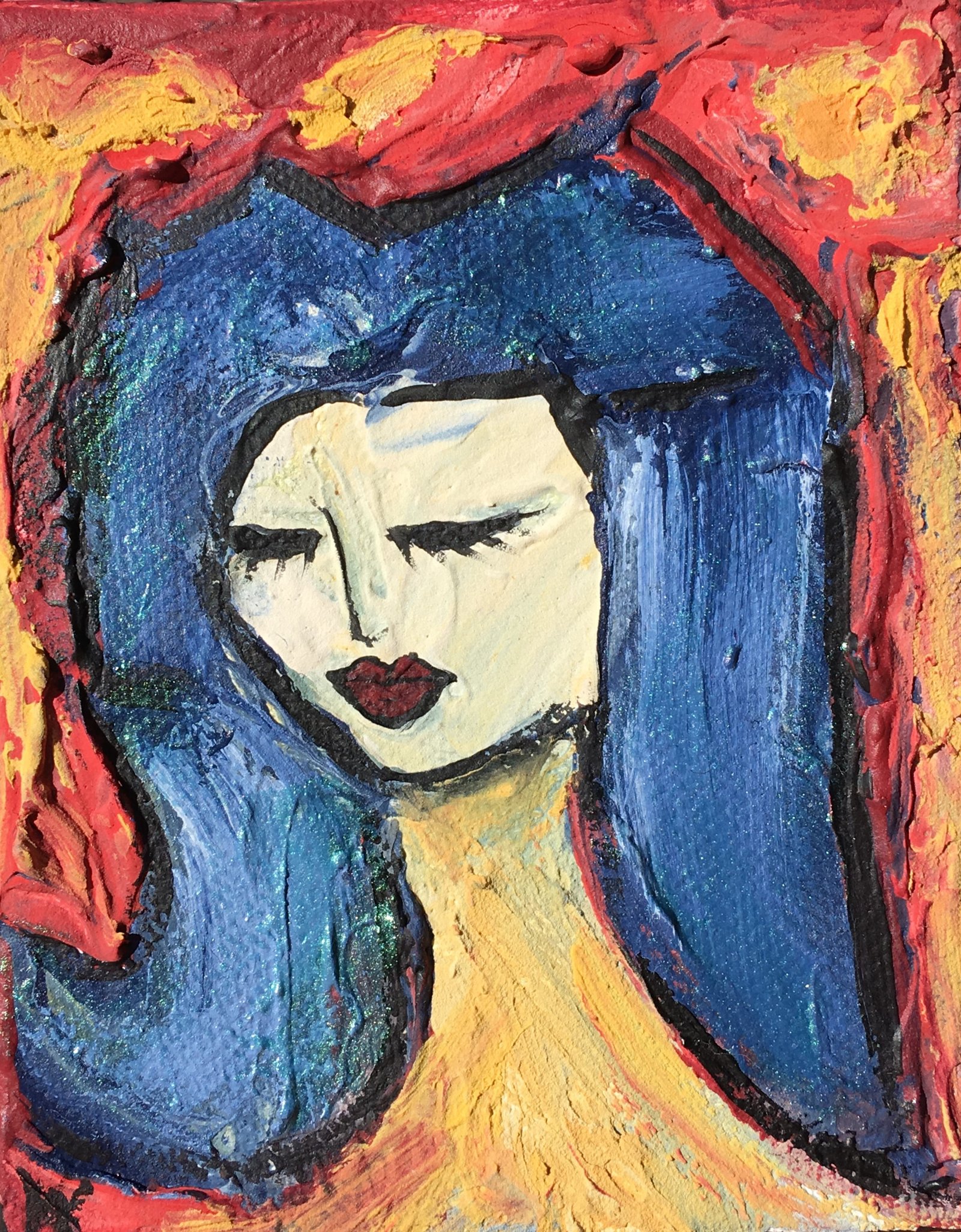 Previous ImageNext Image Blue Cleopatra Blue Cleopatra, $45, 5 x 4”, Mixed Media on Gallery Wrapped Canvas