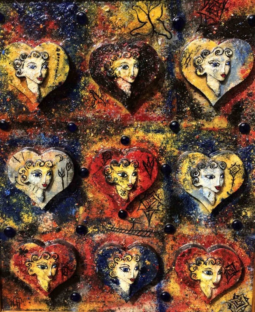 Previous ImageNext Image Nine Loves Nine Loves, 24 x 20″, $1800 Mixed Media with Sculpture on Canvas Board (Frame Needed)