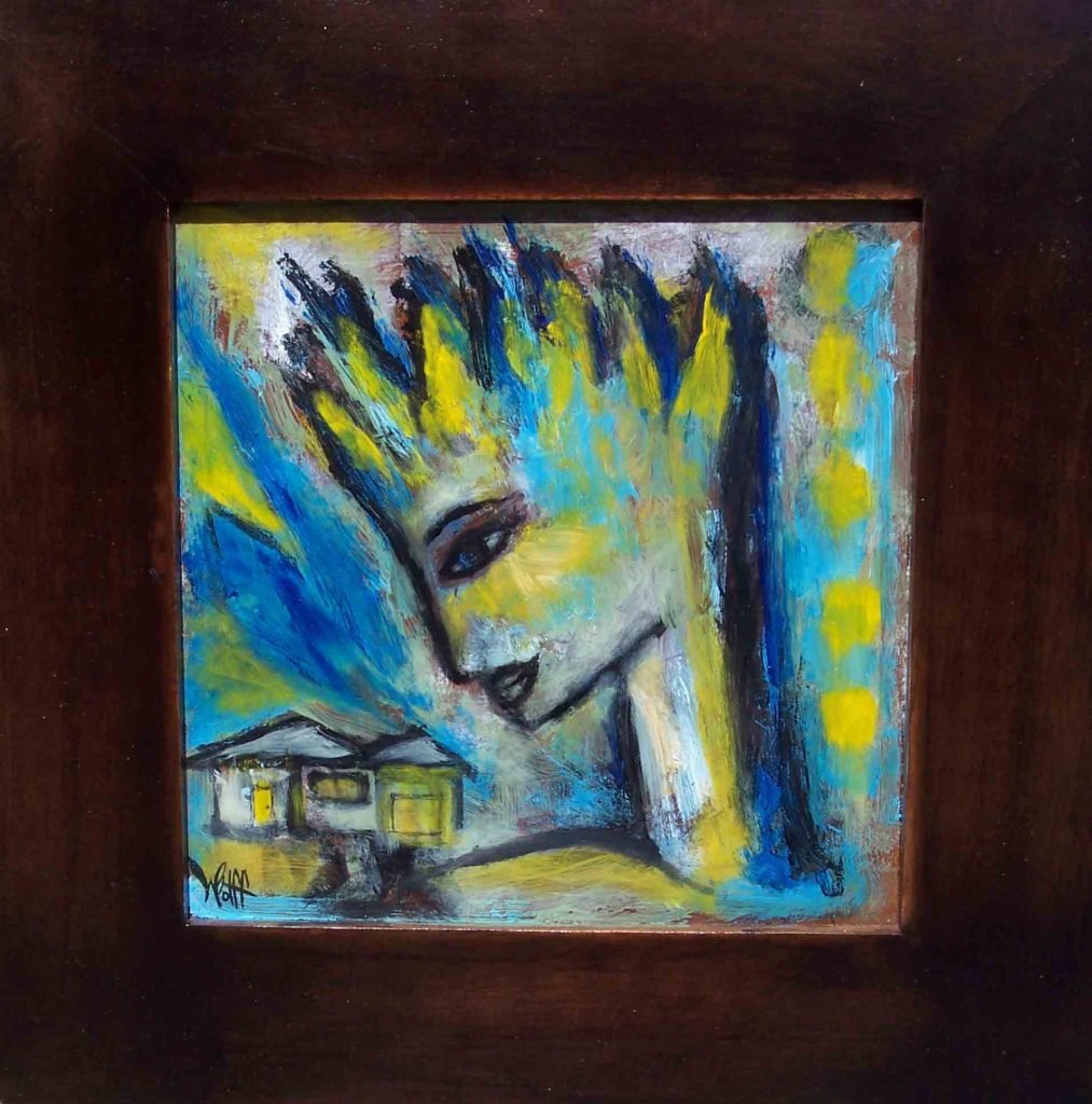 Previous ImageNext Image New Home Angel New Home Angel, 9×9″ HxW (painting), 14×14″ (frame+painting), Oil Paint & Mixed Media on Wood (Frame is Part of Artwork)